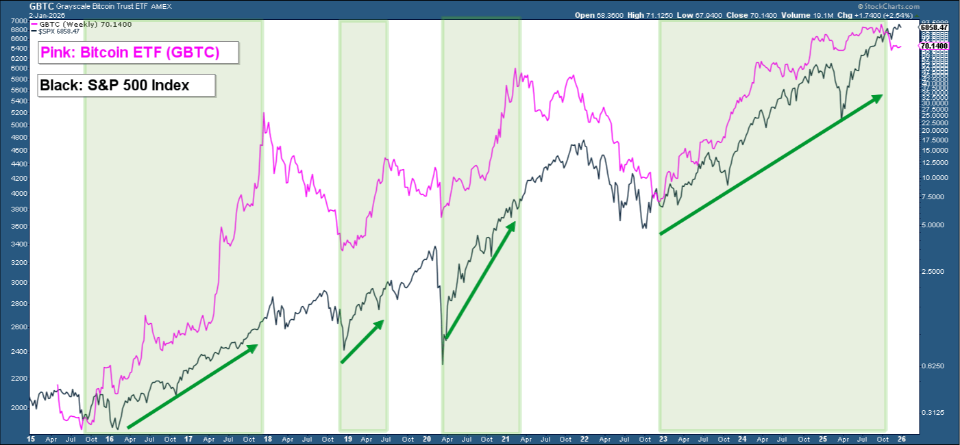 I have shaded several periods in light green to show times when Bitcoin was trending higher. With the benefit of hindsight, these periods generally coincided with strong uptrends in the S&P 500. When Bitcoin is advancing, it typically signals a healthy risk-taking environment, and the stock market has often moved higher alongside it.