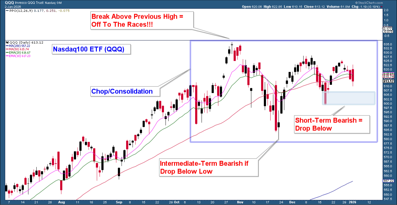 This chart shows QQQ over the past six months and highlights the consolidation that has been underway since early October. I have marked this entire area with a light blue box labeled “Chop / Consolidation.” While the longer-term trend of the market remains up, price action over the past three months has been largely sideways, indicating a pause rather than a clear directional move.