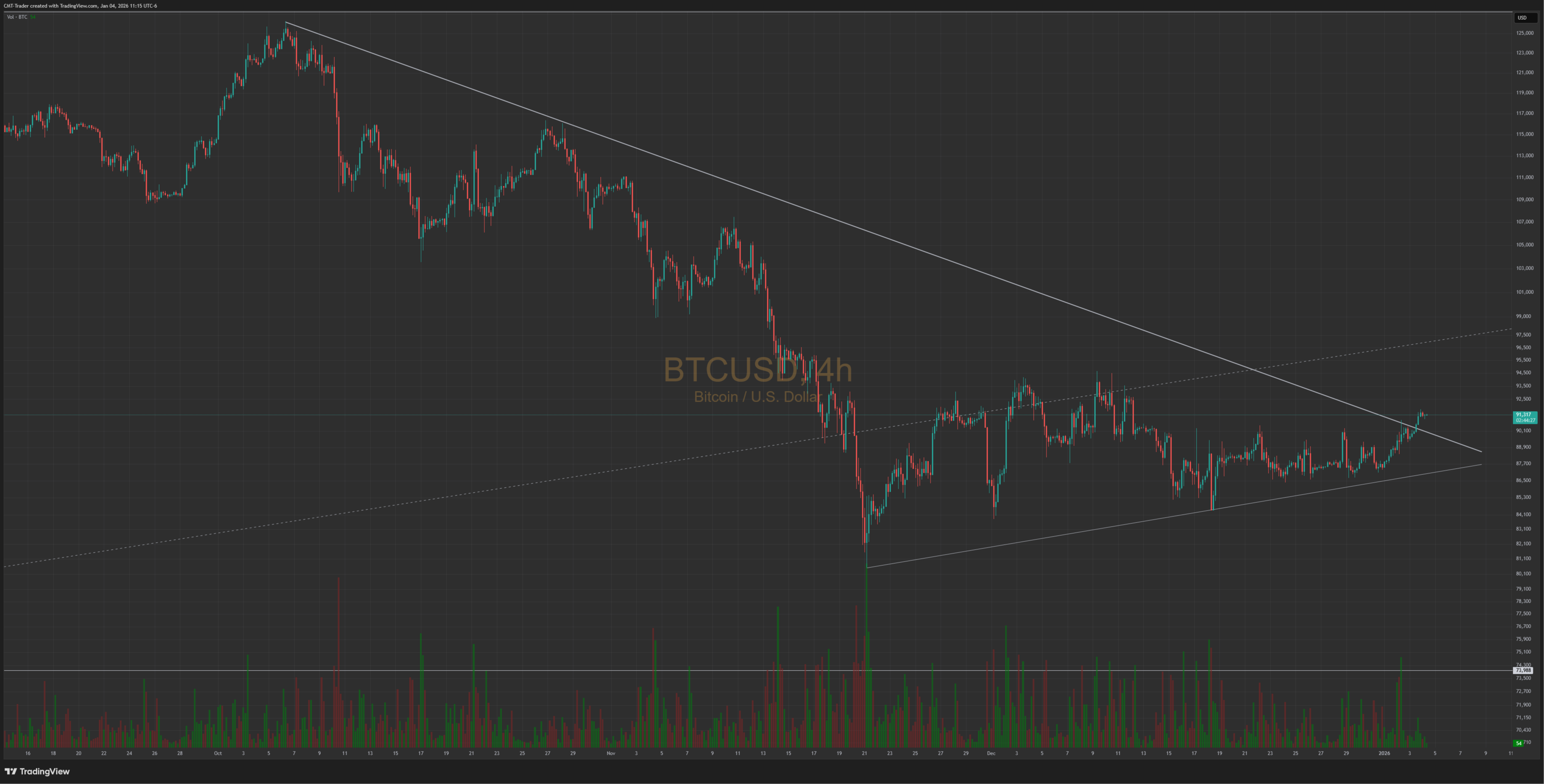 This chart focuses on Bitcoin price action over the past three months, making it easier to see the current technical setup. The goal here is to highlight where Bitcoin is trading relative to both its longer-term trend and its more recent short-term movements.