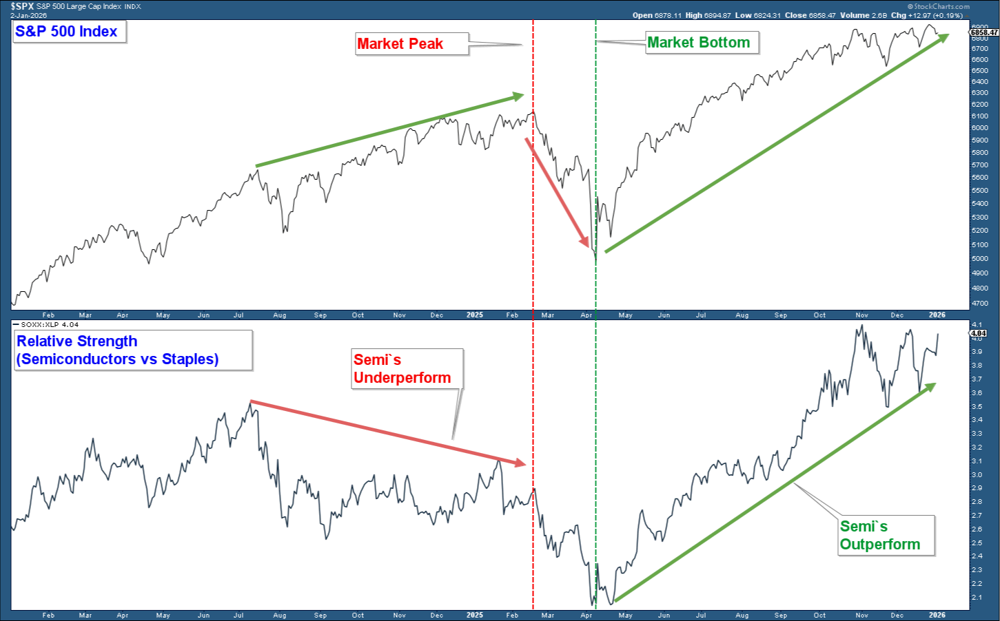 In the top panel, I have marked the February high from last year with a red vertical line. That peak was followed by a sharp market decline that lasted until the April low, which is marked with a green vertical line. Leading into that February peak, the relative strength of semiconductors was already weakening. In the lower panel, this is shown by a red declining trend line, where SOXX underperformed XLP for roughly seven months before the market topping. This negative divergence was an early warning sign that risk appetite was fading.