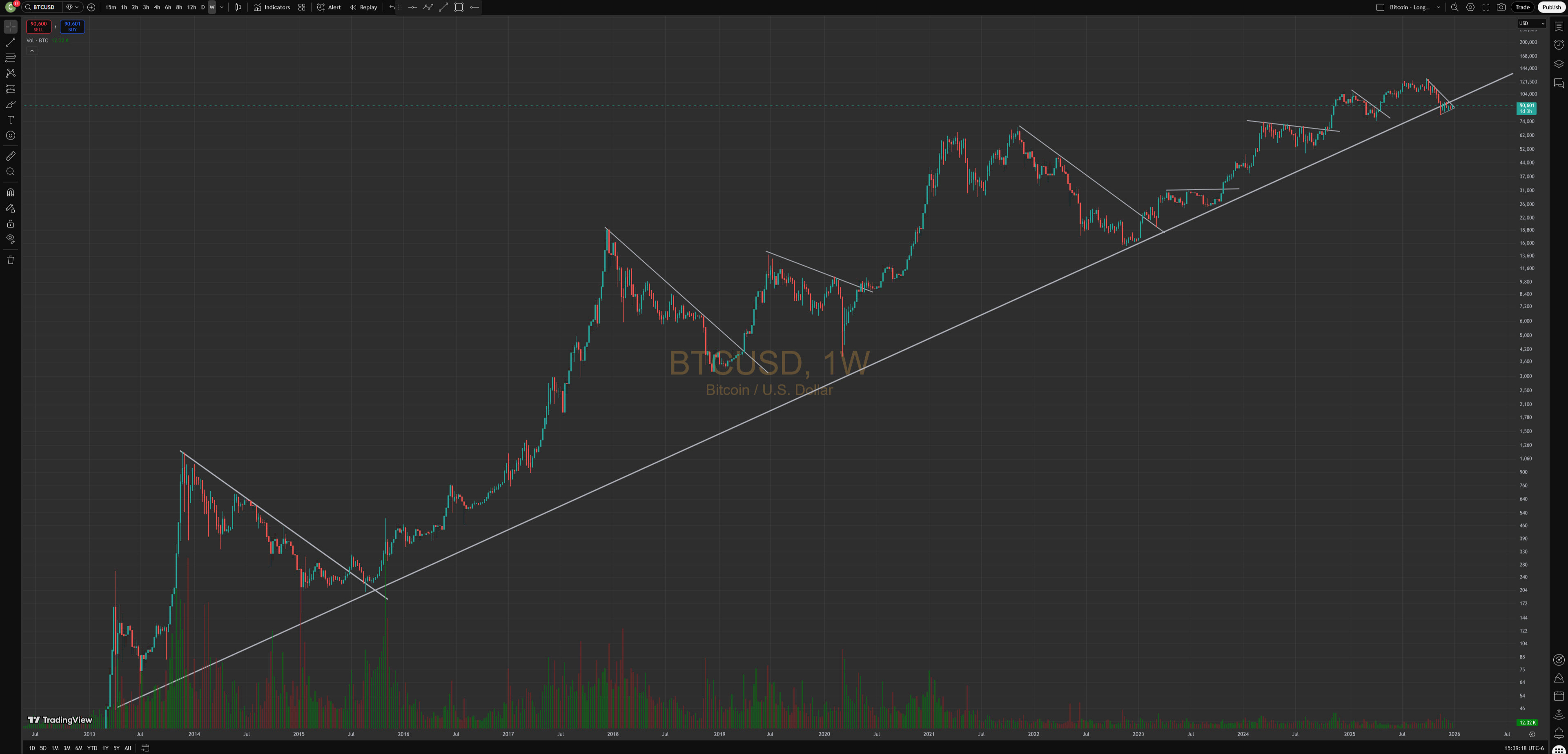 This chart shows Bitcoin going back to 2013 and highlights its long-term uptrend. I have drawn an ascending trendline that connects multiple major lows over more than a decade. This trendline has defined the primary uptrend in Bitcoin and has been tested many times over the years.