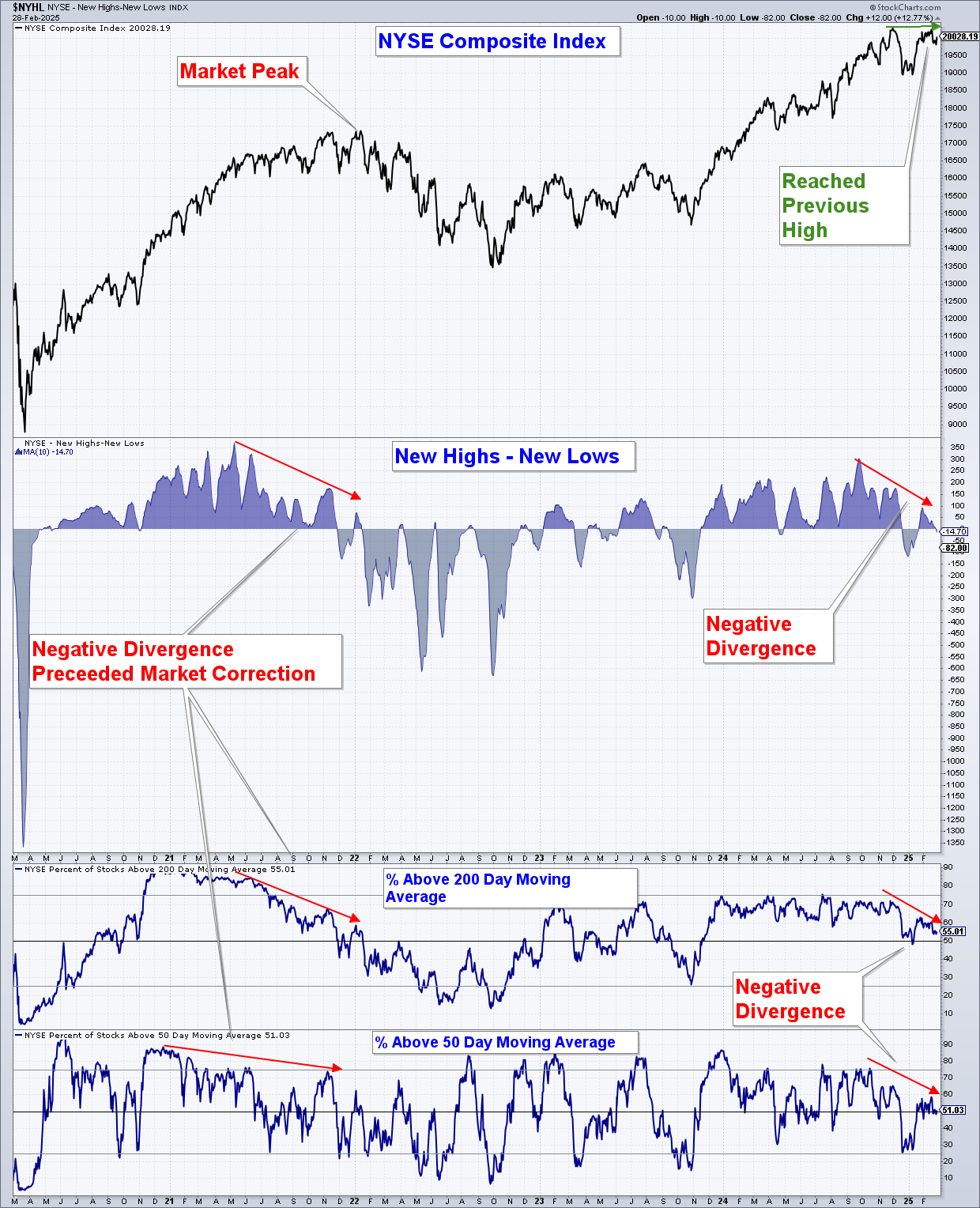 While the NYSE Composite Index has recently revisited its highs from late last year, market breadth is signalling a warning. Beneath the surface, breadth indicators have been deteriorating for months, raising concerns about the sustainability of the market's current bull market advance.