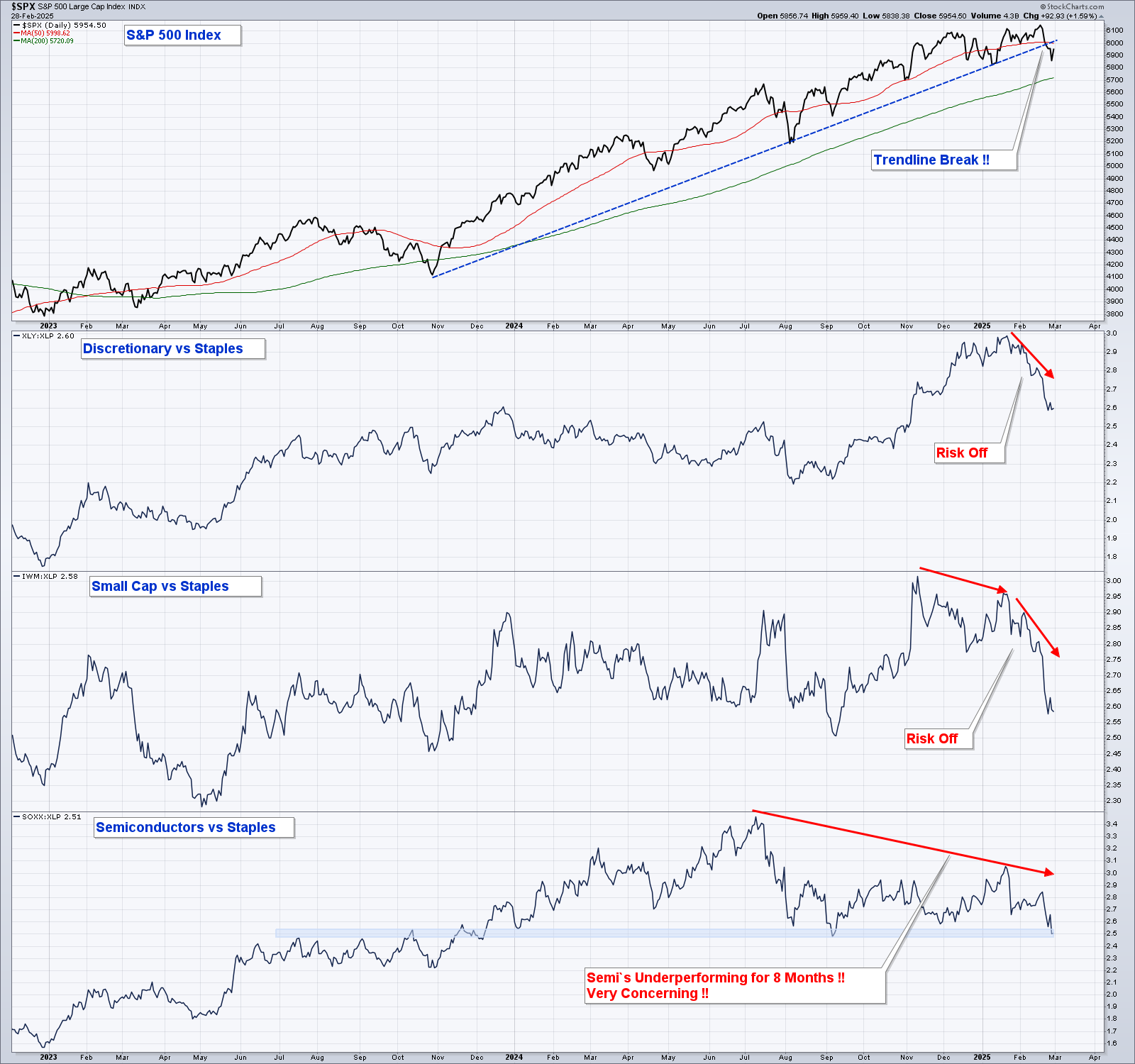 S&P 500 & Trendline Break (Top Panel): The S&P 500 had been respecting an uptrending support line that defined the bull market advance since November 2023. However, with the recent decline, the index has fallen below this trendline for the first time, suggesting a possible shift in market structure.