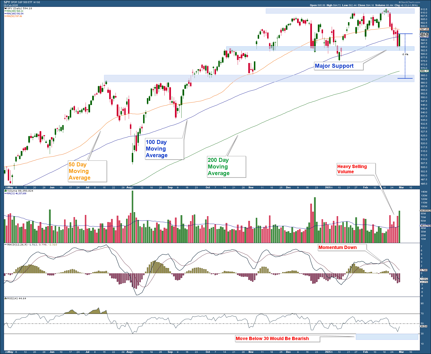 The market has taken a turn this past month, with volatility picking up and key technical indicators signaling caution. The S&P 500, which had been trading within a well-defined range (Darvas Box) for the past four months, has now fallen sharply, testing a critical support level that has been in place since November 2024. The decline over the past week has been particularly notable, with the index dropping over 4% on heavy selling volume.